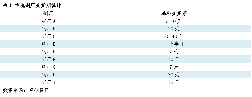从供应角度来看,河北产区库存持续偏高状态(丰南地区卷板库存近期基本处于持续增加的状态,截至本周库存数据增至77万吨,其中基料占比在7-8成的水平),钢厂交货期尚可(见表1),供应存压力。