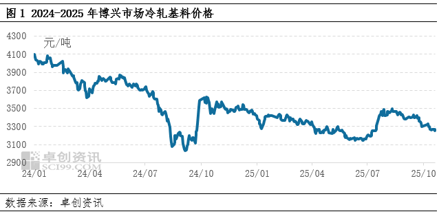 见图1,10月份小长假之后,冷轧基料价格出现短暂上行,其余时间则跌势为主。截至10月22日,冷轧基料博兴市场月均价格3283元/吨,环比下跌3.11%,同比下跌7.19%。这与需求情况有较为明显的关系。