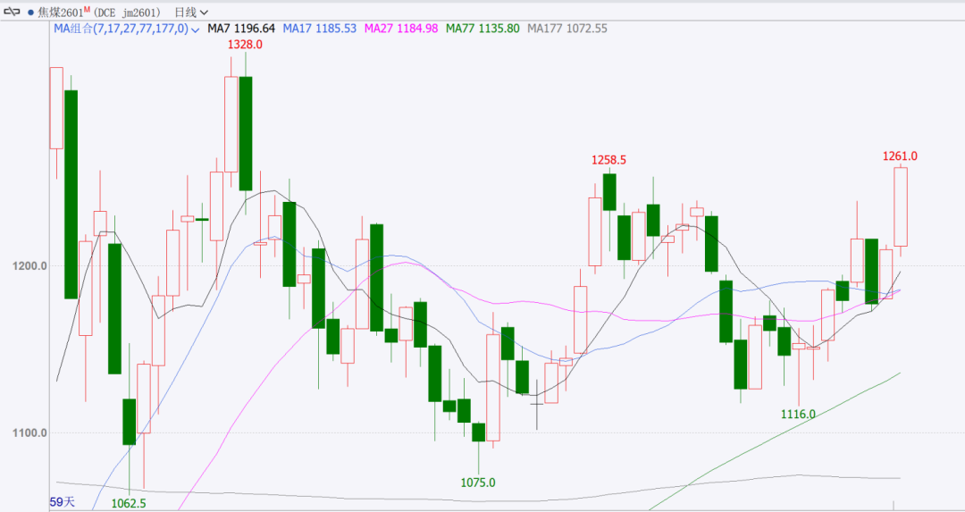 焦煤期货延续昨日强势上涨态势,刷新逾2个月以来的最高水平。其中,焦煤期货涨幅超5%,价格上探1261点,短期市场做多情绪显著升温。
