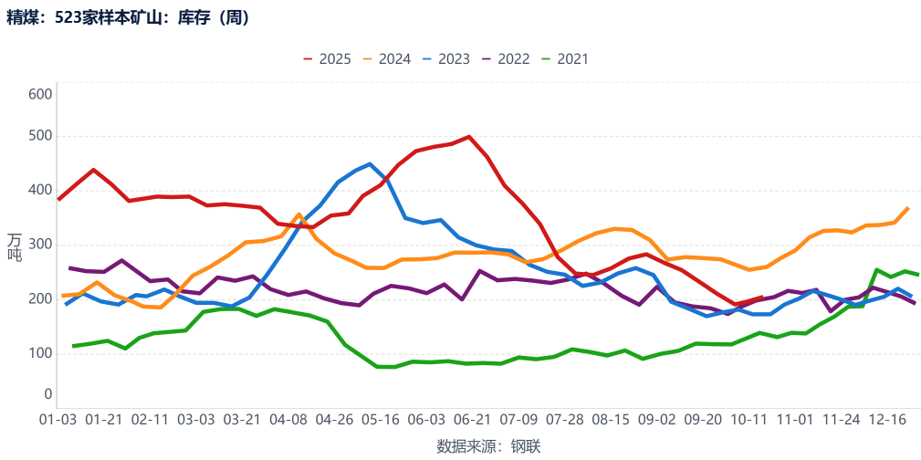 (3)下游企业及中间环节采购需求显著提升,带动库存加速去化:原煤库存环比减少18.3万吨至443.1万吨,创下近8个月新低;精煤库存减少15.9万吨至189.5万吨,较去年同期降幅进一步扩大至34.79%。供需两端的反向变动持续强化市场偏紧格局,为焦煤价格提供较强支撑。