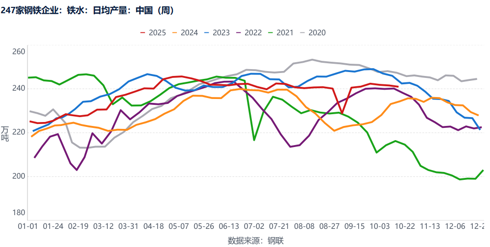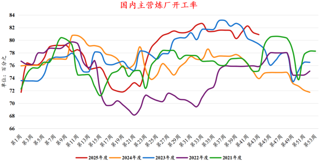 (2)供应端,据EIA数据显示,截至10月23日,美国原油周度日均产量为1362.9万桶/日,较上期小幅降低0.7万桶/日,产量仍处于近几年同期最高水平,供应量整体处于高位。原油供应风险主要来自于国际地缘局势的影响,特朗普与普京的会晤被搁置,美国与委内瑞拉地缘局势的对原油供应造成一定的风险。此外,中东至远东地区的原油运费较国庆假期后上涨约0.8美元/桶。