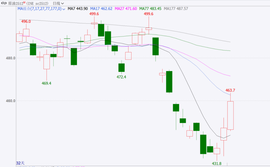 今日原油主力合约价格以446.5元/桶的价格开盘,盘中价格大幅上涨后回落震荡,截至收盘报价为459.7元/桶,日涨幅达4.05%。