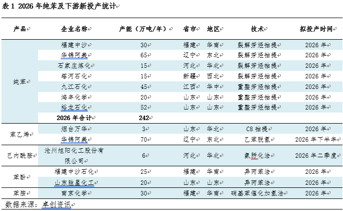 预计2026年纯苯供需结构将弱于苯乙烯,驱动两者价差(苯乙烯-纯苯)趋向中等或偏高。其主要逻辑在于:纯苯面临新产能与高进口的双重供应压力,且国产供应调节机制受限;而其主要下游之一己内酰胺的需求疲软,将拖累纯苯价格。反观苯乙烯,其产能增速放缓,供需格局有望迎来边际改善。下文将从供需基本面进行简析。