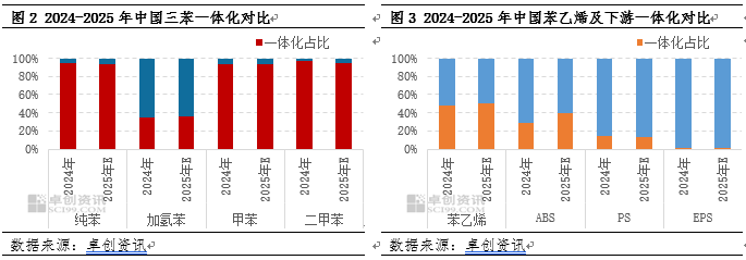 纯苯供应端:首先,如表1所示,2026年石油苯计划新增约242万吨,加氢纯苯计划新增约10万吨;但五大下游累计新投产仅154万吨(其中2026年苯乙烯仅两套装置预计共有73万吨),折算对纯苯的消费量130万吨。其次,进口货源的冲击可能加剧供应压力,中美贸易摩擦背景下,来自韩国等地的富余纯苯可能更多涌入中国市场。最后,如图1和图2所示,石油苯一体化程度显著高于下游产品,但因其本质是炼油副产品,装置开工缺乏独立性,灵活性受限,或降低石油苯供需自适应能力。