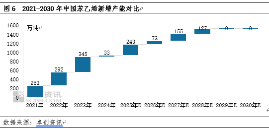 苯乙烯供应端,供应压力或减轻,如图5所示,2026-2030年中国苯乙烯新投产力度明显放缓,五年累计新投产预计为355万吨,其中2026年新投产预计仅为73万吨;此外,进口端预计将维持在低位,整体进口依赖度进一步降低。
