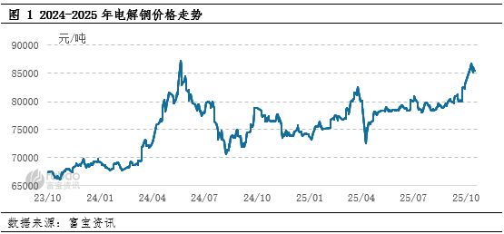10月中旬铜价冲击84000元/吨成功,延续震荡上涨节奏,短线站稳84000元/吨一线。截至10月20日,国内电解铜现货85870元/吨,同比上涨12.43%。