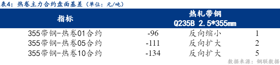 23日市场热卷01合约与唐山355带钢价差反向缩小1元/吨,热卷05合约与唐山355带钢价差反向扩大2元/吨。