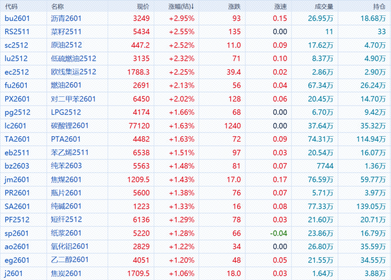 10月23日,午市收盘,国内期货主力合约涨多跌少。焦煤涨超5%,焦炭、SC原油、碳酸锂涨超4%,燃料油、鸡蛋涨超3%。跌幅方面,油菜籽、棕榈油跌超1%。