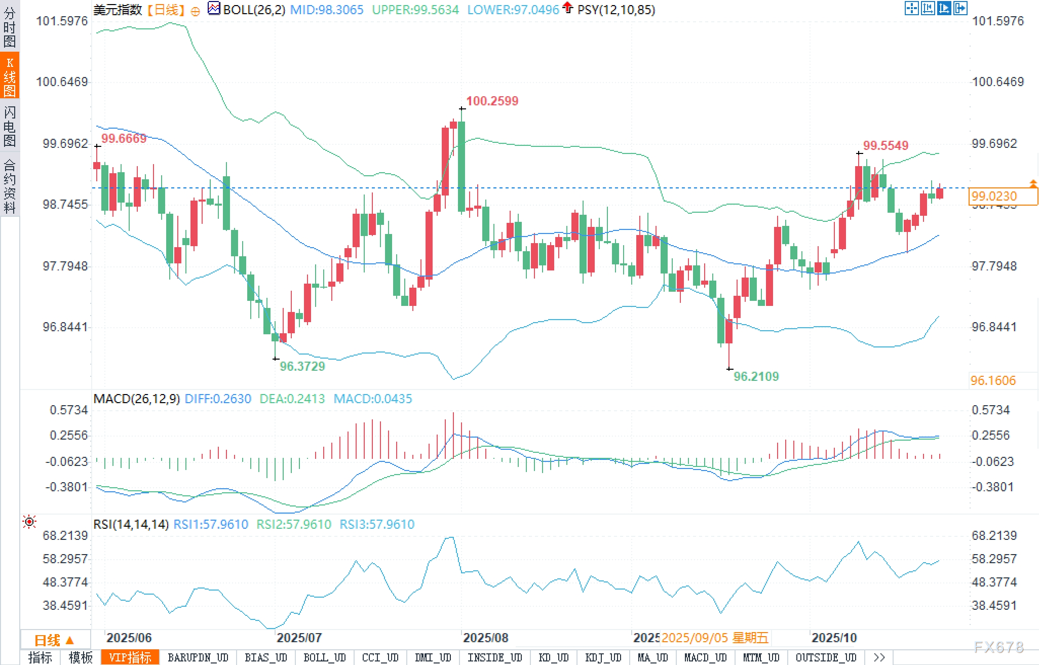 汇通财经APP讯——周四(10月23日),美元指数欧洲时段继续围绕99一线拉锯。过去一个多月,美元先在96.2109附近探底回升,随后上冲至99.5549后回落整理;更早前的阶段高点在100.2599。短线进入关键时间窗,数据与政策预期的小幅偏离就可能决定99一线是“中继站”还是“终点站”。