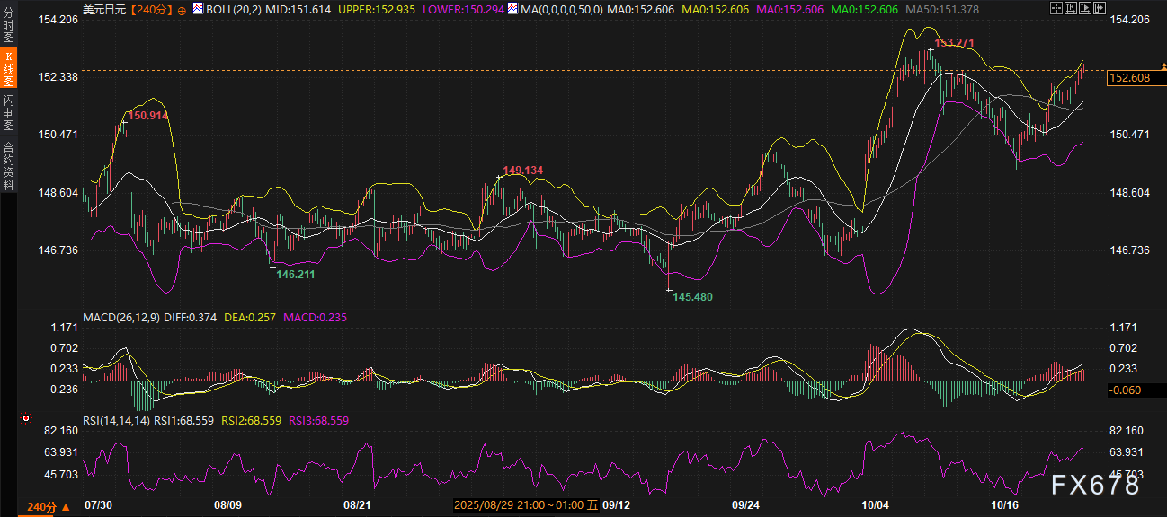 转向技术面,4小时图上的信号正为这一基本面叙事提供有力佐证。当前报价152.625,已稳稳站上灰色50周期均线151.378,这一线作为短期支撑,正有效阻挡了上周低点的余波。布林带结构显示,中轨位于151.616,上轨152.942,下轨150.291,汇率正逐步贴近上轨,通道扩张的迹象初现,暗示多头动能的蓄积而非单纯的超买拉伸。RSI 14周期指标读数68.760,虽接近超买阈值70,但尚未触发极端信号,显示上涨仍有弹性空间。这一配置,与日内0.43%的涨幅相呼应,表明盘面正从上周的150探底中逐步消化空头压力,转而测试153.30的选举后高点。