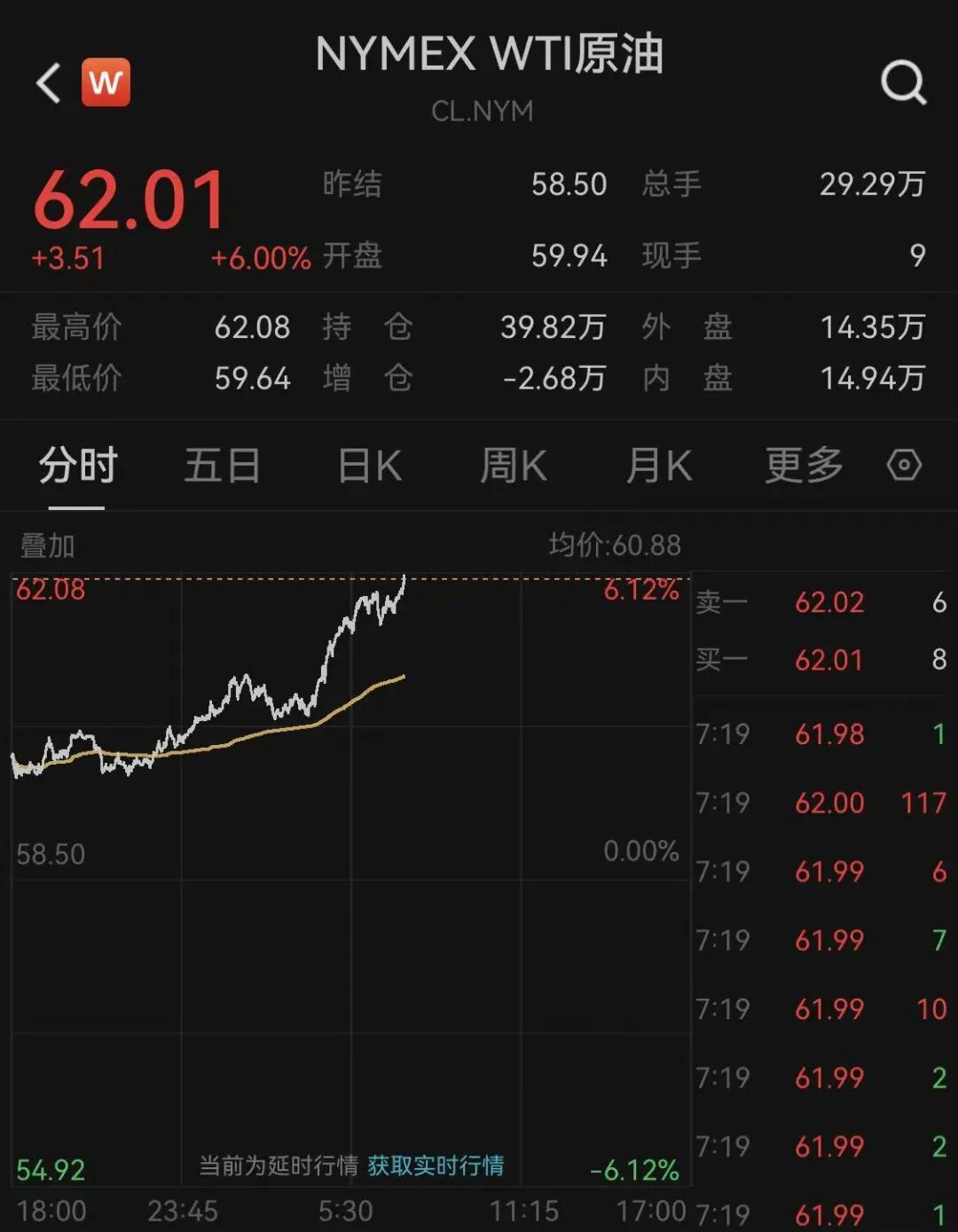 WTI原油期货涨幅扩大至6%,最高报62.08美元/桶。布伦特原油涨5.55%,报66.066美元/桶。