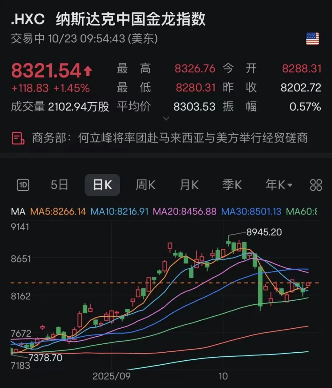 中概股则集体大涨,截至发稿,纳斯达克中国金龙指数涨逾1.4%。个股方面,盛大科技涨超5%,迅雷涨近4%,百度集团、阿里巴巴涨逾2%。