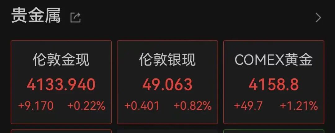 消息面上,现货黄金盘中突然直线反弹,截至发稿涨0.2%,一度突破4140美元。此外,现货白银向上触及49美元/盎司,日内上涨超0.8%。