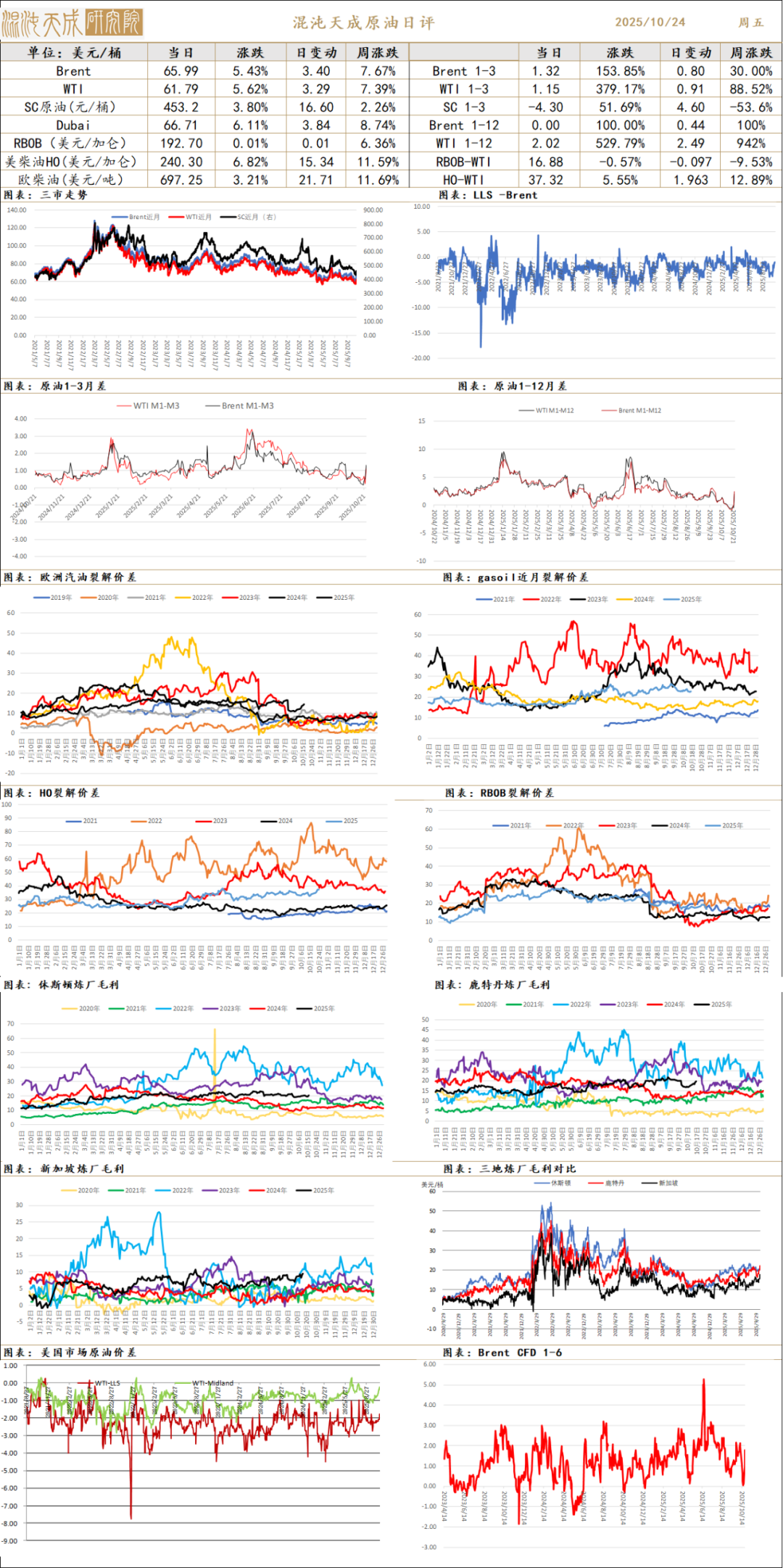 需求:中美经济官员将在马来西亚会面,贸易冲突有望缓和。EIA数据显示美国柴油表需回升,但汽油偏弱,美国政府关门仍未结束。