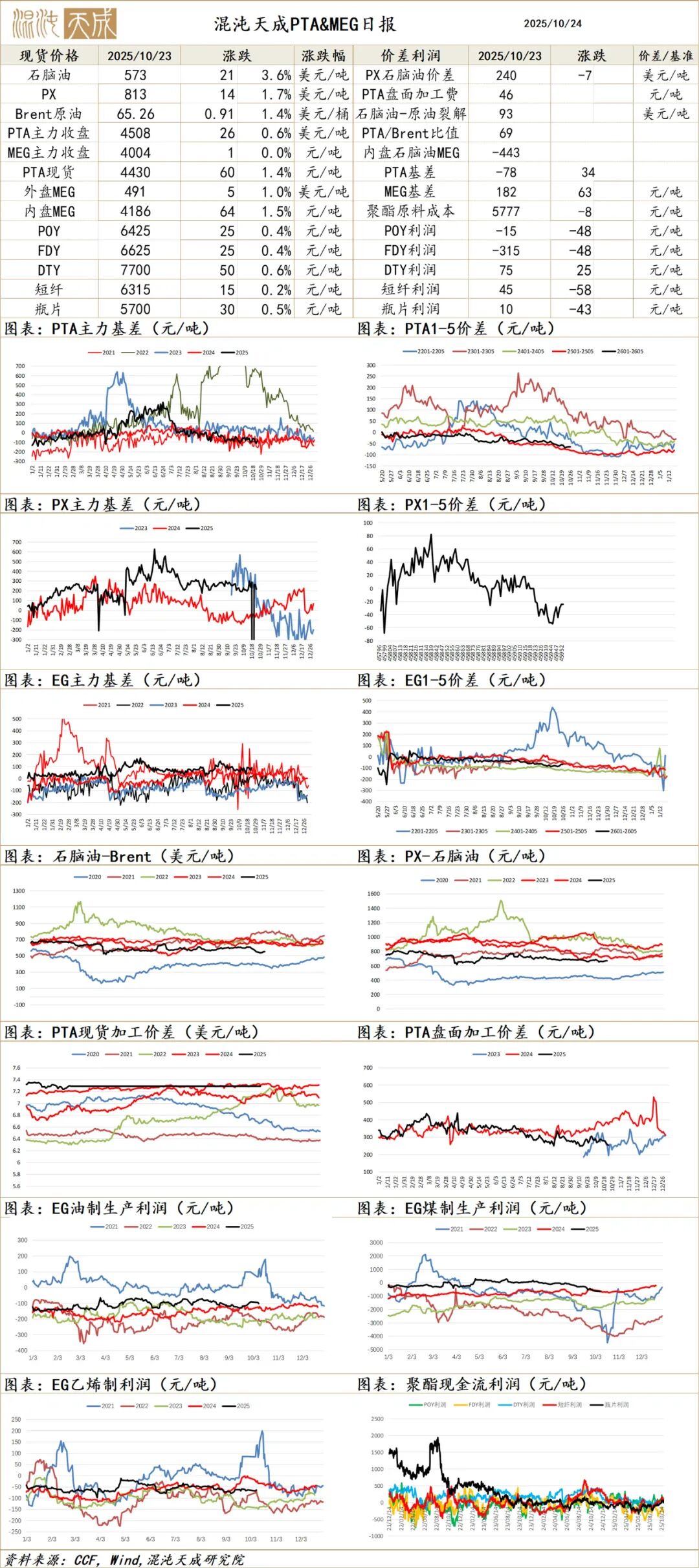 需求端:截止10.23,聚酯开工持稳87.5%。终端织造开工回升至55.5%,目前需求仍较好主要内销超预期;预计需求10月见顶,11月开始走弱,下游高开工低利润高库存。