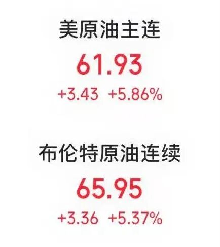 截至收盘,WTI原油期货涨5.62%,报61.79美元/桶。布伦特原油期货涨5.43%,报65.99美元/桶。