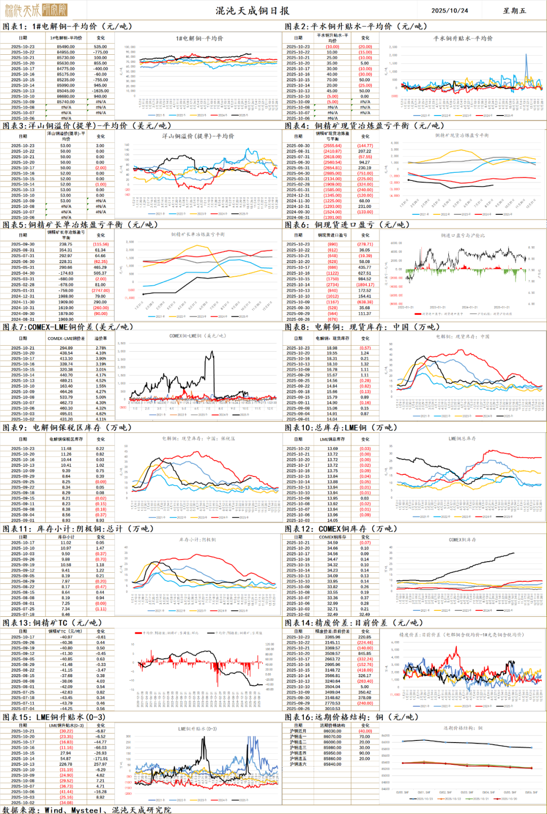 宏观环境上,上周五受到中美贸易政策和美股回调的影响,整体市场预期出现回落从而短线抑制铜价出现了显著回调;而周末风险尚未发酵,周一美股走势相对平稳,铜价震荡走势;昨日受到中美会面预期和美股的相对走强而再次向上拉升;国内方面,9月GDP数据4.8%符合预期,但是名义GDP仍维持-1%,深度通缩改善较小。9月工增维持高速增长,与PMI数据吻合,其中汽车、食品和石油增长靠前,同时也是库存增速高和利润降低快的行业。投资端数据已经放缓,但是生产端仍然保持高增,经济数据偏弱带来需求预期的抑制。但“十五五”经济增长目标导向相对“十四五”更加明确,重提“以经济建设为中心”,政策预期相对乐观。