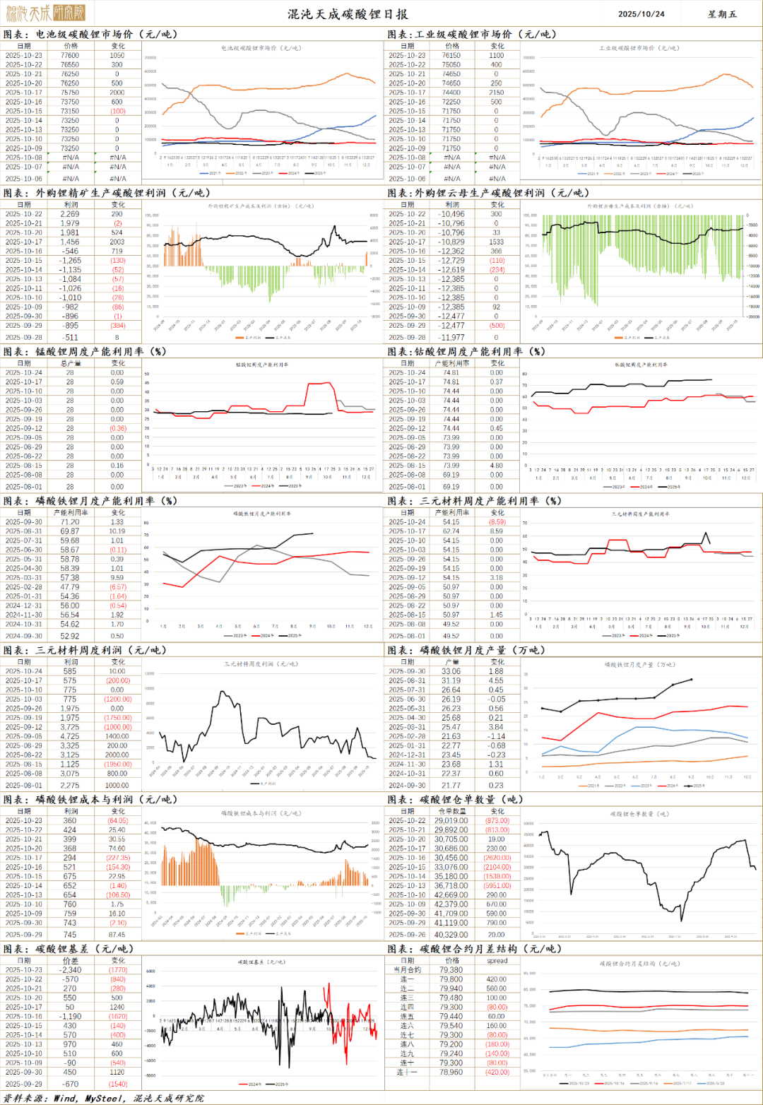 昨日碳酸锂主力合约收盘价79940元/吨,涨跌幅4.17%。主力合约持仓+65916至419147手,仓单-260至28759吨。现货方面,电池级碳酸锂报价+1050至77600元/吨,工业级碳酸锂报价+1100至76150元/吨。锂精矿均价+25至880美元/吨。