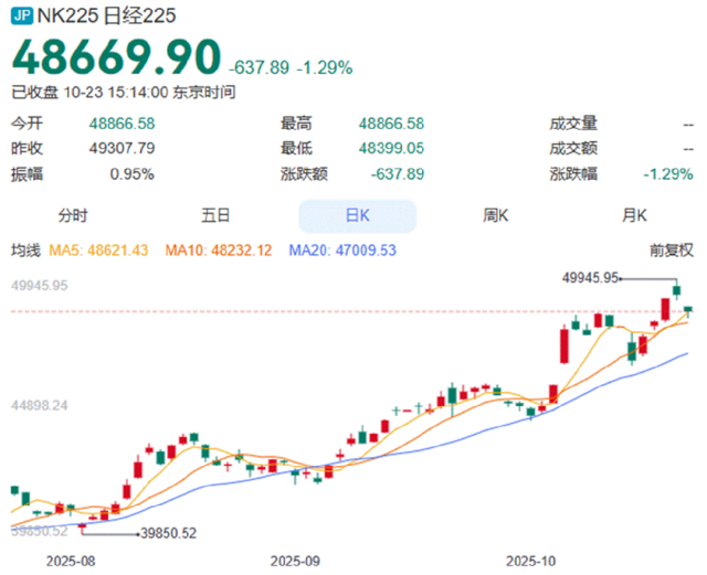 49945.95!距离5万点仅一步之遥!然而就在人们以为在本周就能见到日经指数突破历史性的50000点时,10月23日,日经指数迎来当头一棒,盘中大跌超过700点,跌破10月21日刚突破的49000点关口。不过即便如此,日经225指数仍旧吸引着全球金融市场的目光,年内累计涨幅已超20%。