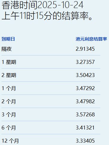 10月24日,港元拆息普遍向下,而与楼按相关的一个月拆息报3.47292%,跌6.803基点;反映银行资金成本的三个月拆息报3.57268%,跌4.125基点。