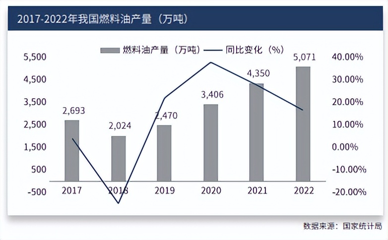 近年来,随着我国原油加工量增长,燃料油产量呈上涨趋势。2018年起消费 税改革,国内深加工配套装置发展,燃料油产量整体上升。2022年产量为5071万 吨。