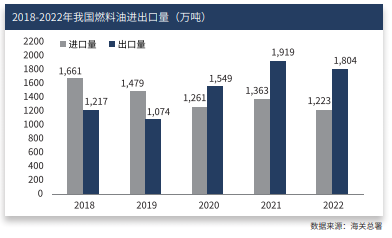 2022年我国燃料油进口量为1223万吨,同比减少10.27%;出口量为1804万 吨,同比减少5.99%。