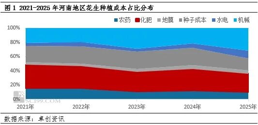河南产区近5年来,理论种植成本在正常年份占比情况整体变动不大。农药、化肥、地膜等农资成本约占总成本的50%左右,种植成本约占22%-25%,水电成本约占4%-5%,机械成本约占20%左右。2025产季种子、化肥等农资价格整体下降,成本出现缩减,但生长期天气不理想导致浇地成本提升,同时收获阶段土壤湿度大,机器无法使用,部分农户人工刨出,增加了人工折算成本。初步测算2025产季河南地区花生种植总成本(不含地租)约944元/吨,同比走高17.27%。具体收益观望中,春花生收益变动不大,麦茬花生、蒜茬花生等观望后续价格。