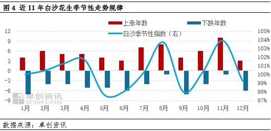 根据卓创资讯统计近11年数据显示,花生价格波动具有季节性特征:8月份新花生局部上市,正常情况下较陈米价格高,9月份随着新花生上市地区的扩大,价格下行概率增加;10-11月供应释放速度趋于平缓,油厂、市场等陆续采购,价格有触底回升可能;12月随着下游采购的陆续扫尾,价格有一定下调概率。