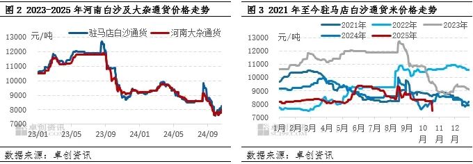 河南地区驻马店、信阳、南阳局部白沙新花生上市初期开秤价格约在9000-9800元/吨,根据颗粒大小论价;大杂花生上市初期价格约8600-8800元/吨,东北地区白沙通货米上市初期价格约8600-8700元/吨。截止到10月22日,驻马店地区白沙花生通货米收购均价参考7500元/吨,较上市初期下滑20.21%;河南地区大杂花生通货米收购均价参考7800元/吨,较上市初期下滑10.34%;东北地区白沙通货米收购均价参考8300元/吨,较上市初期下滑4.05%。天气因素延缓河南麦茬新花生上市时间,价格季节性下滑幅度较同期收窄。