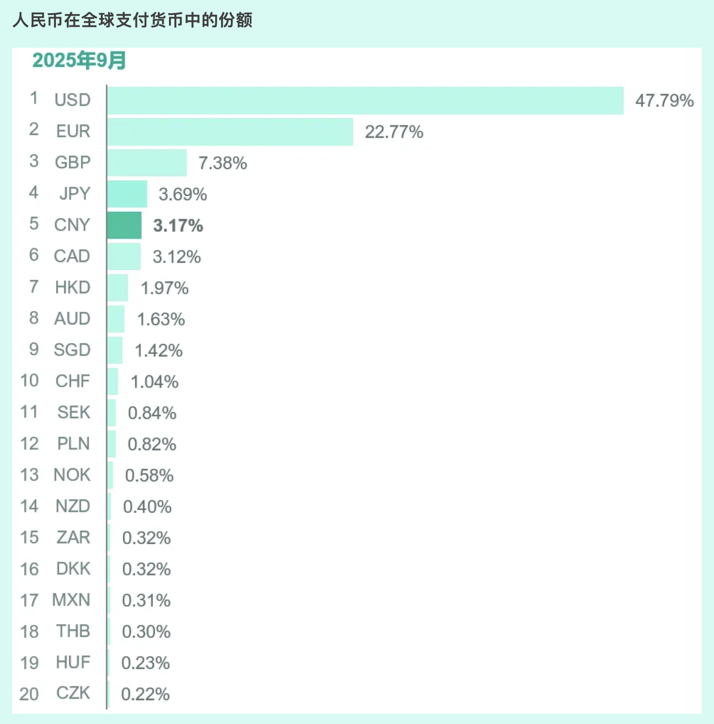 据Swift最新数据,2025年9月,在基于金额统计的全球支付货币排名中,人民币在全球支付领域位列第五、排名上升一位,占比3.17%。与8月相比,人民币支付金额总体增加了15.53%。