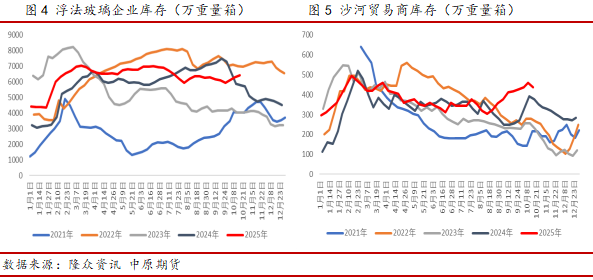 9月份受环保扰动及国庆节前中下游阶段性补库影响,企业出货情况较好,带动玻璃厂内库存环比有所去化。而10月以来受雨水天气及中游出货影响,玻璃厂产销表现偏弱,企业库存转为持续累积状态,截止到2025年10月16日,全国浮法玻璃样本企业总库存6427.6万重箱,环比+145.2万重箱,同比2024年年增幅达11.14%,处于往年同期偏高位水平,中上游高库存对玻璃价格反弹空间仍然存在较强限制。