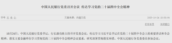 中国人民银行党委召开会议,传达学习党的二十届四中全会精神。