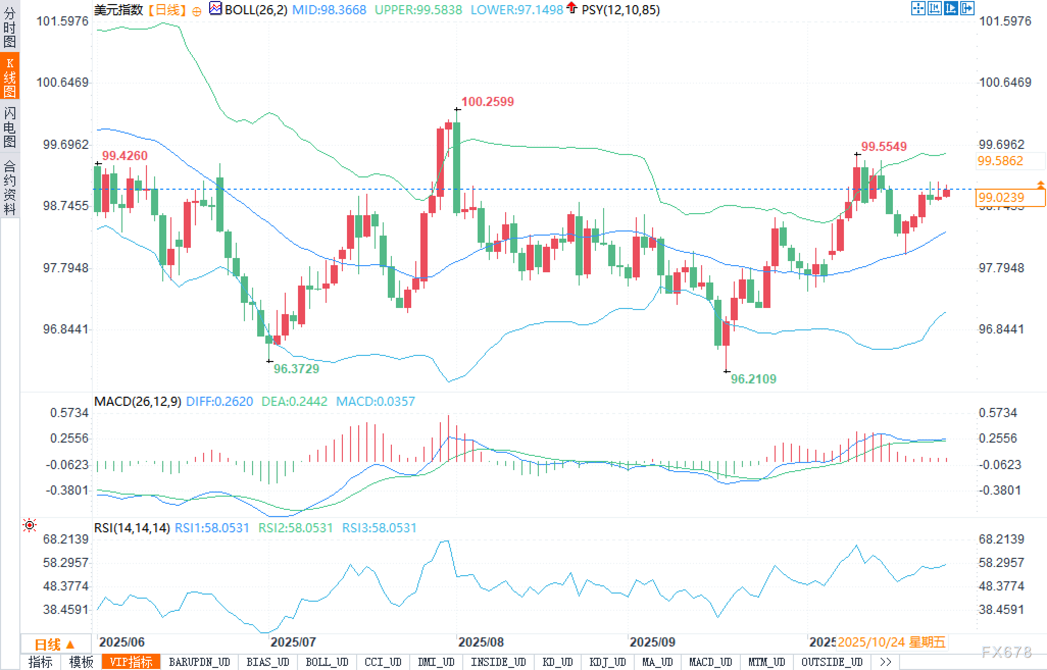 汇通财经APP讯——周五(10月24日),欧洲时段美元指数位于99附近。行情围绕99关口反复拉锯,波动率温和,未形成单边惯性。盘面结构显示,多空均有抓手:一方面,宏观数据预期指向通胀边际黏性但整体可控;另一方面,宽松路径仍在推进,令利差优势与避险溢价出现拉扯。