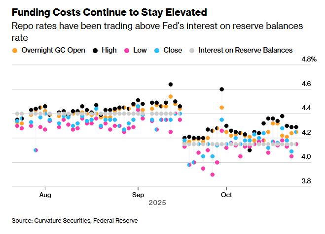 Mark Cabana表示,根据美联储认为短期利率应相对于准备金利息(IORB)所处的位置,该央行可能需要“回补”约1500亿美元流动性。达拉斯联储主席洛根(Lorie Logan)在8月表示,美联储正在关注市场利率是否稳定在接近或略低于IORB的水平。尽管美联储内部对准备金的理想水平看法不一,但在部分利率已升破IORB之后,耐心似乎正在消耗殆尽。