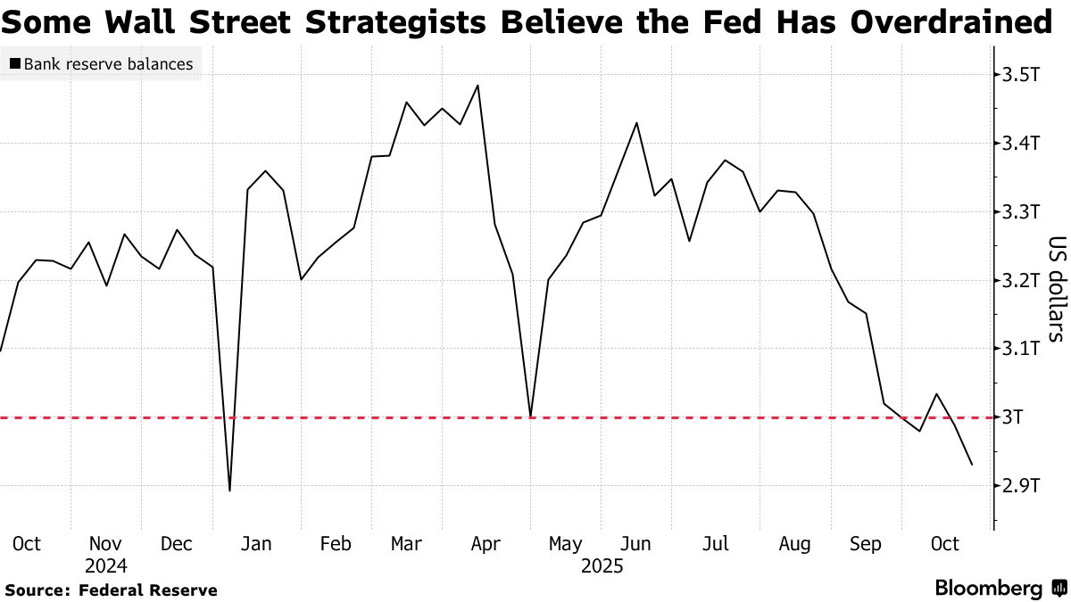 最新的信号是,美国银行体系准备金本周跌破3万亿美元关口,为连续第二周下滑。美国银行体系的准备金水平是美联储决定是否继续缩减资产负债表的关键因素。数据显示,截至10月22日当周,银行准备金下降约590亿美元至2.93万亿美元,创下自1月1日当周以来最低水平。