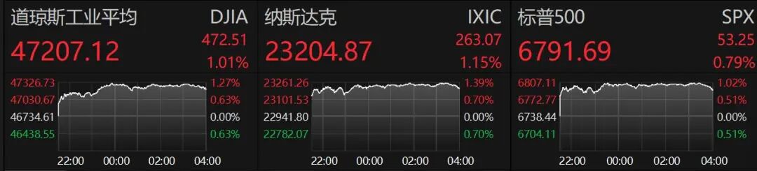截至10月24日收盘,纳指涨1.15%,本周累计上涨2.31%;道指涨1.01%,本周累涨2.2%;标普500指数涨0.79%,本周累涨1.92%。