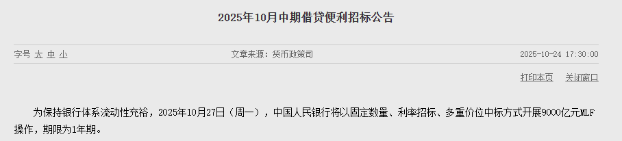 中国人民银行10月24日消息,为保持银行体系流动性充裕,10月27日(周一),中国人民银行将以固定数量、利率招标、多重价位中标方式开展9000亿元MLF操作,期限为1年期。