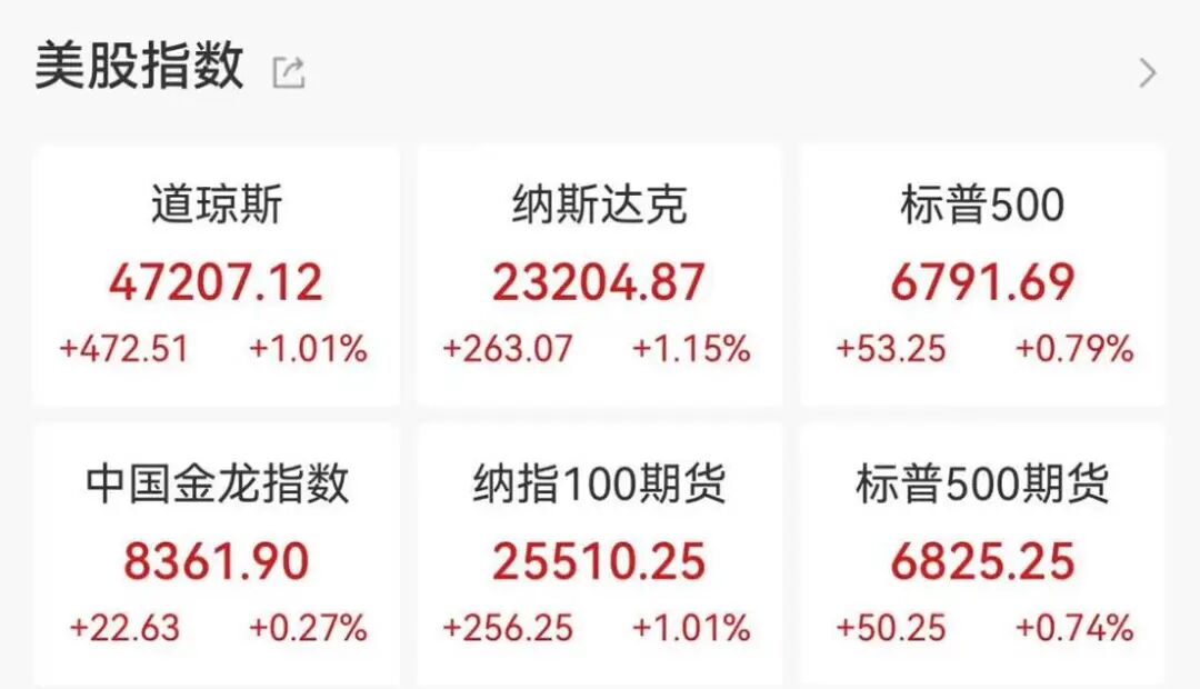 美股三大指数齐涨,均创历史收盘新高。截至收盘,道指收涨1.01%,报47207.12点;纳指收涨1.15%,报23204.87点;标普500指数收涨0.79%,报6791.69点。本周,美股三大指数均录得约2%的涨幅。
