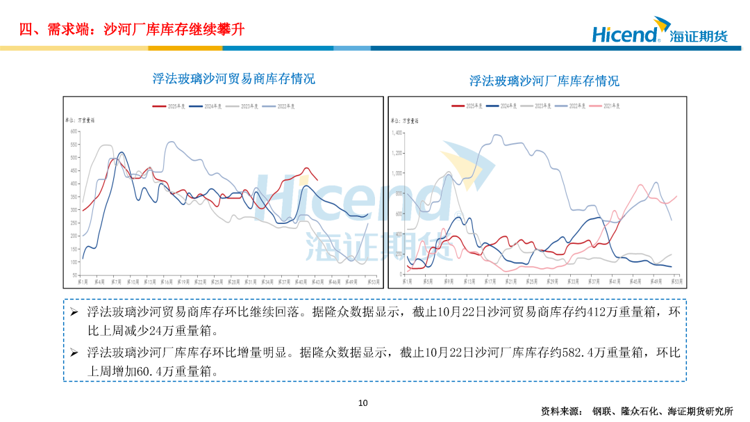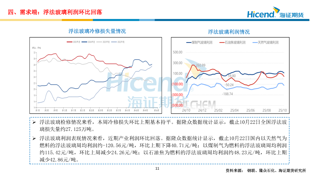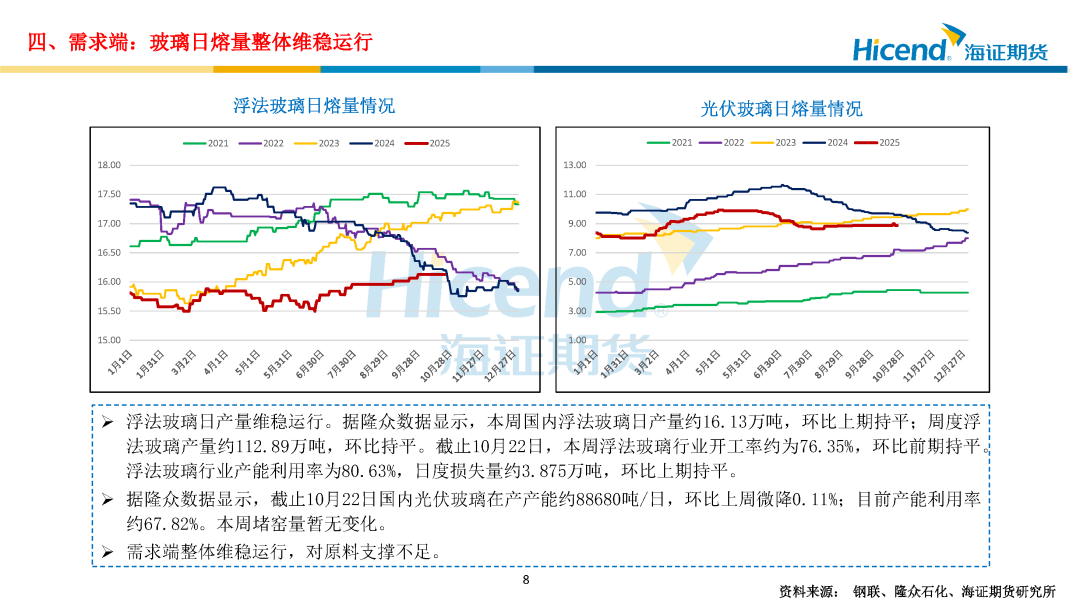 近期纯碱市场呈现部分抗跌性主要受宏观预期情绪提振,而自身供需变动相对有限。基本面供需数据来看,本周开工环比微增,后续装置检修与恢复交织使得供给端短期或延续高位震荡,下游需求则延续弱稳,市场采购情绪欠佳,短期来看产业去库或部分令盘面承压。此外近期煤炭价格坚挺亦使得成本端支撑渐显。整体来看现阶段纯碱供需并未得到实质性改善,宏观政策预期情绪提振下盘面价格有所企稳。短期来看价格或震荡调整,中期供需宽松预期下恐弱势难改。