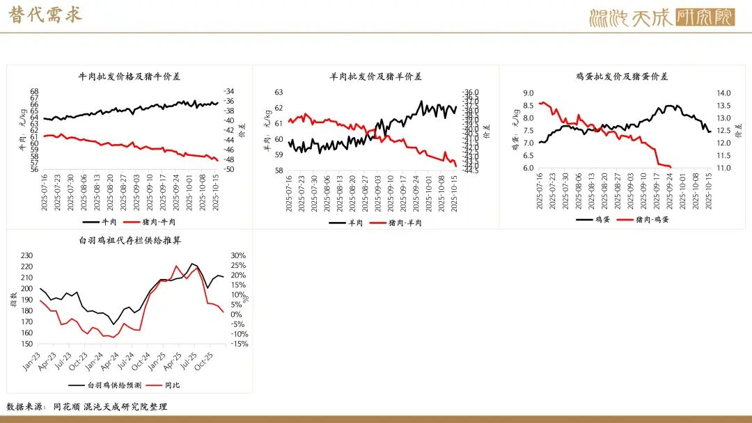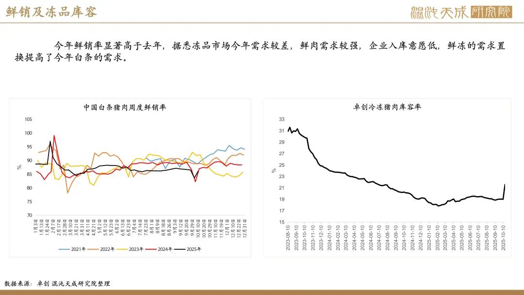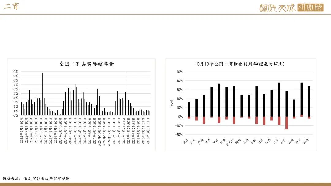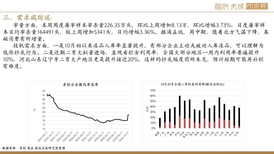 投机需求方面,一是10月初以来冻品入库率显著提升,有部分企业主动或被动入库冻品,可以理解为低价抄底行为。二是近期二育大批量进场,直观看栏舍利用率,全国大部分地区一周内利用率普遍提升10%,河北山东辽宁等二育大户地区更是提升接近20%,这样的抄底幅度前所未见,预计短期可能再补栏有难度。