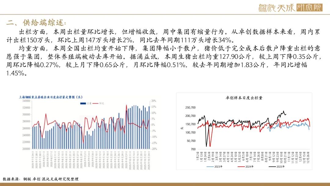 出栏方面,本周出栏量环比增长,但增幅收敛,周中集团有缩量行为。从卓创数据样本来看,周内累计出栏150万头,环比上周147万头增长2%,同比去年同期111万头增长34%。