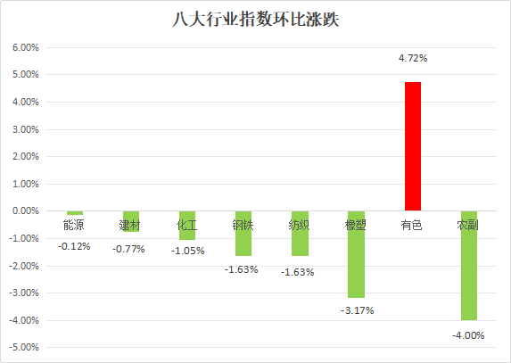 个行业,本周涨跌互现,上涨前三的分别是能源行业,涨幅为0.61%,建材行业,涨幅为0.33%,化工行业,涨幅为0.13%。下跌前三的分别是农副行业,跌幅为-0.74%,有色行业,跌幅为-0.58%,橡塑行业,跌幅为-0.17%。