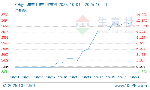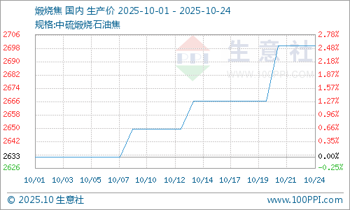 据生意社商品分析系统显示,本周地炼石油焦行情震荡上涨,截止到10月24日山东市场地炼石油焦价格为2700.75元/吨,较10月17日2633.25元/吨上涨2.56%。