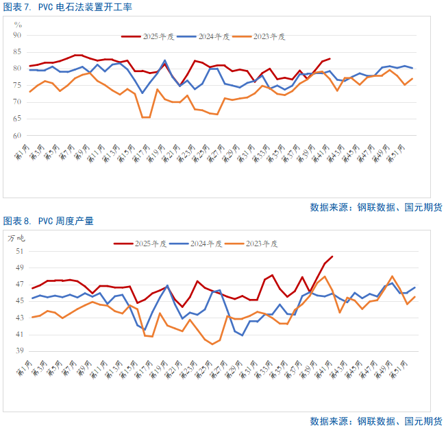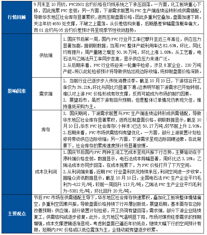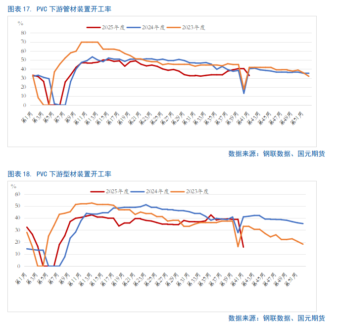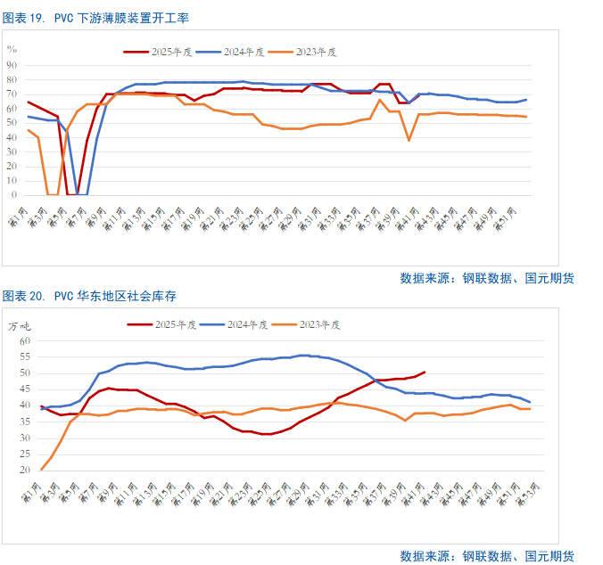 节后PVC市场在供需错配主导下,华东地区社会库存快速累积,叠加贸易战风险与美政府停摆等因素冲击,市场悲观情绪蔓延,化工板块整体情绪偏空,多重利空因素共振,导致盘面价格持续下行并屡创新低。展望后期,基本面存在边际改善预期:供应端,部分装置计划检修,开工负荷有望回落;需求端,部分下游企业陆续复工,供需结构或逐步修复。此外,北方地区气温明显下降,市场对煤炭旺季需求的预期增强,成本支撑逻辑逐渐显现。考虑到盘面已逼近年初低点,继续大幅下行的空间预计有限,短期内PVC价格或以低位震荡为主。