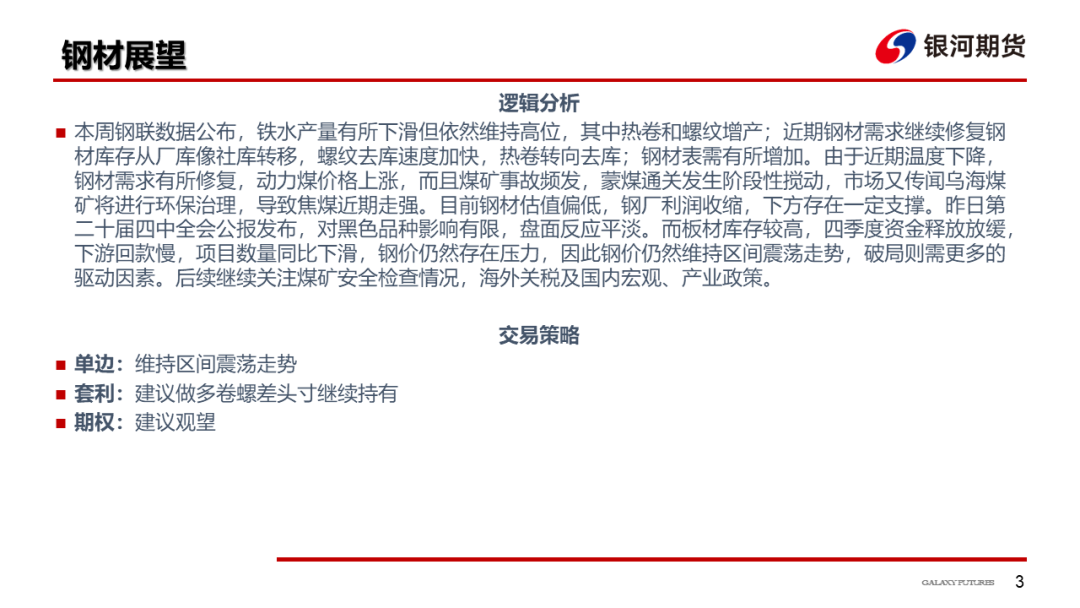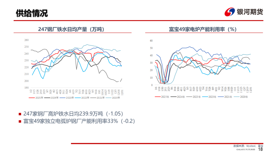 上周钢材现货市场价格下跌,热卷跌幅相对较大,截止上周五,唐山螺纹4040元 (-40) ,华东上海螺纹4140元( 10) ;热卷方面,天津热卷4100元 ( 10) ,上海热卷4160元( 30)。2月9日,NS五大品种钢材整体产量增32.45万吨,五大品种库存厂库环比增26.32万吨,社库增107.87万吨。表观需求768.22万吨(农历同比-0.96%),环比增146.6万吨。长流程现货端,截至2月10日,螺纹现金含税利润低位波动,华东螺纹长流程现金含税成本4199元,利润-59元左右,热若长流程现金含税利润-139元左右。电炉端,华东平电电炉成本在4345元左右,谷电...