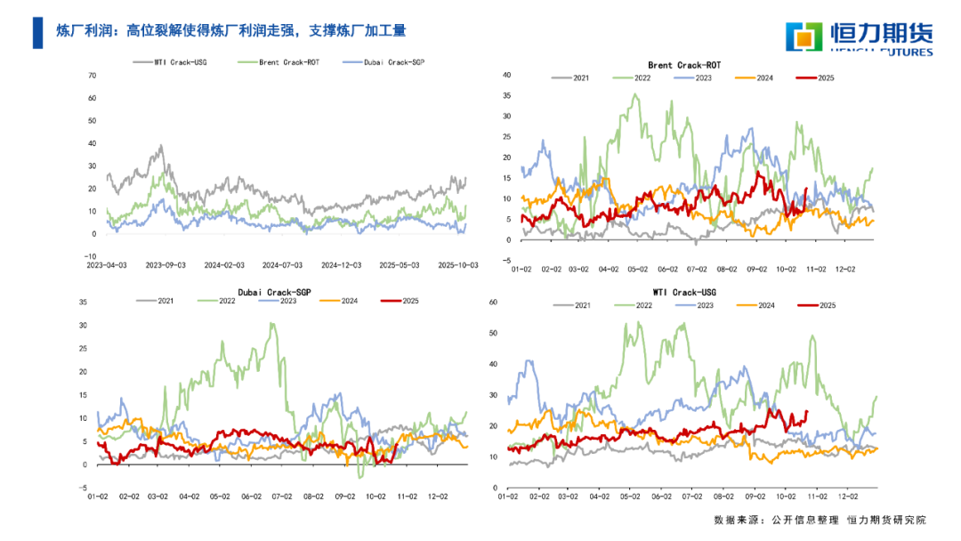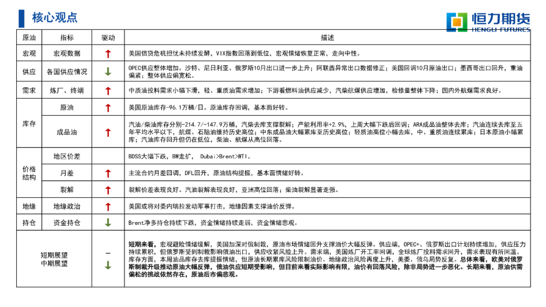 短期来看,宏观避险情绪缓解,美国加深对俄制裁,原油市场情绪回升支撑油价大幅反弹。供应端,OPEC+、俄罗斯出口计划持续增加,供应压力持续累积,但俄罗斯受到制裁影响俄油出口,供应收紧风险上升。需求端,美国炼厂开工率回调,全球炼厂投料需求回升,需求表现有所回温。库存方面,本周油品库存去库提振情绪,但原油长期累库风险限制油价。地缘政治风险再度上升,美委、俄乌局势反复。总体来看,欧美对俄罗斯制裁升级推动原油大幅反弹,俄油供应短期受影响,但目前来看实际影响有限,油价有回落风险,除非局势进一步恶化。长期来看,原油供需偏松的挑战依然存在,原油后市偏悲观。