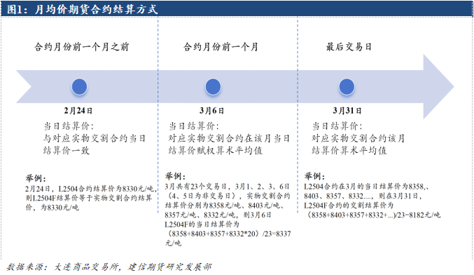 以L2504F合约为例,自挂牌起至2025年2月底,每个交易日的当日结算价锚定L2504合约的当日结算价;在2025年3月,即合约月份前一个月,L2504F合约每个交易日的当日结算价根据L2504合约在3月全部交易日的当日结算价计算得到,其中该交易日及其之后交易日均取L2504合约在该交易日的当日结算价。2025年3月共有23个交易日,L2504合约在3月前4个交易日的结算价分别为8358元/吨、8403元/吨、8357元/吨、8332元/吨,那么L2504F合约在3月第4个交易日的当日结算价为[8358+8403+8357+8332*20]/23=8337元/吨。3月最后一个交易日,L2504F合约到期,交割结算价为L2504合约在3月所有交易日当日结算价的算术平均值。