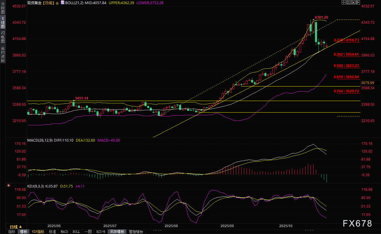黄金需要跌破4000美元才能为显著的回调提供依据。从技术角度看,黄金似乎已在7月至10月暴涨行情的23.6%斐波那契回撤位下方找到支撑。