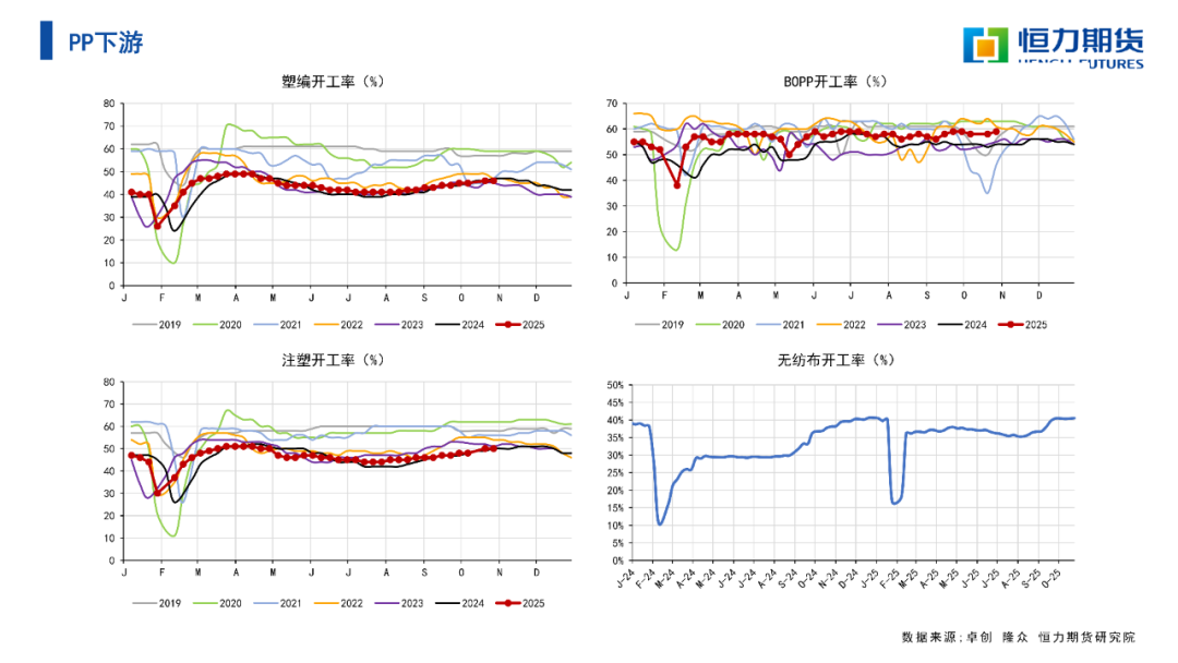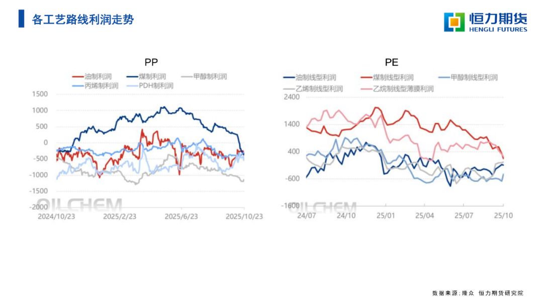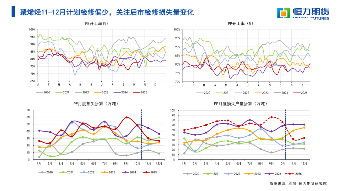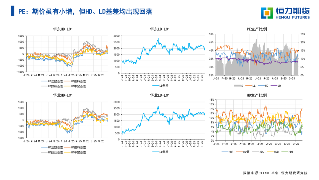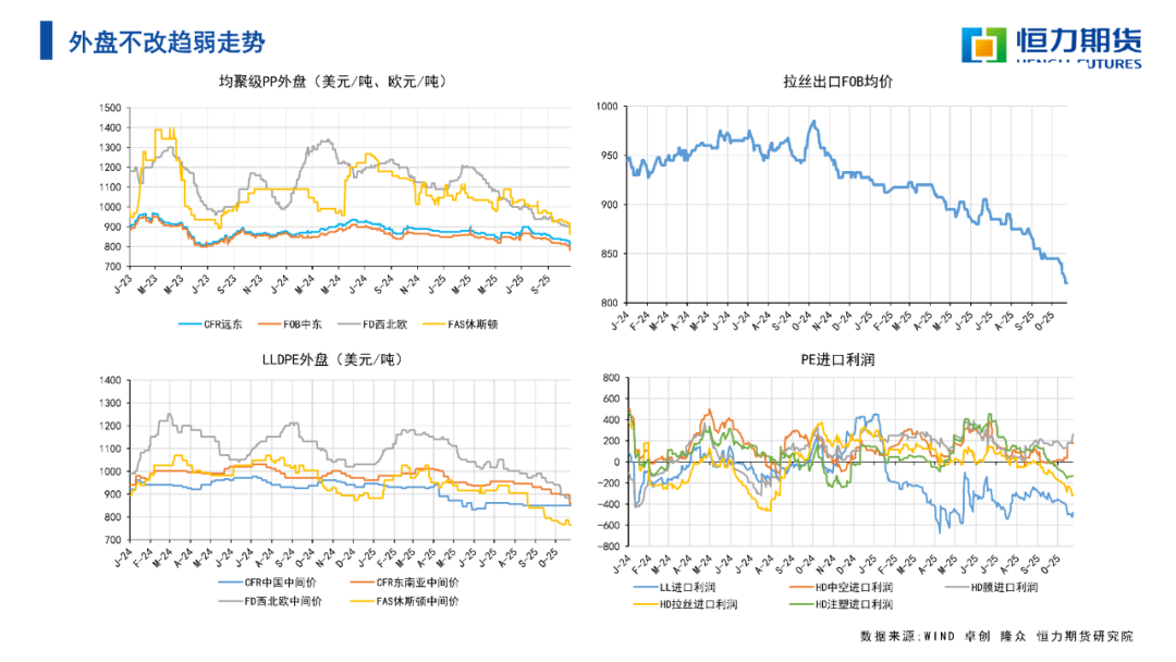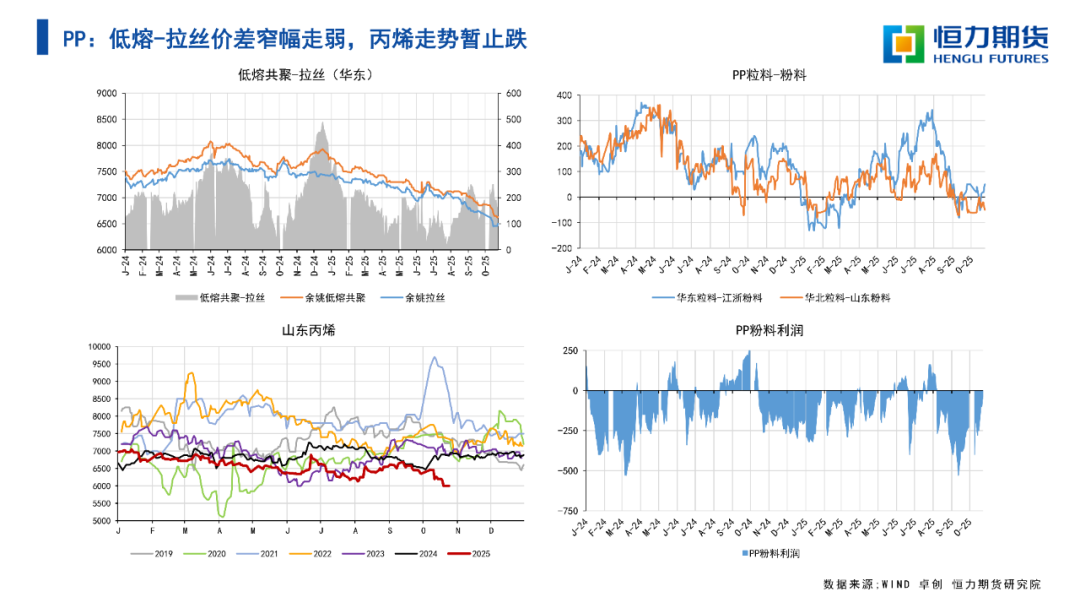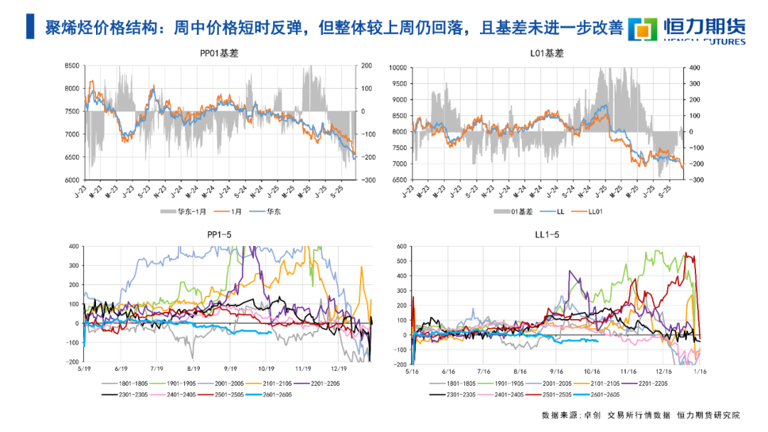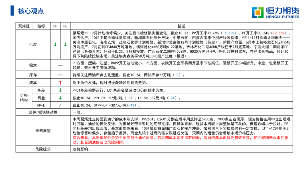 本周聚烯烃走势受到油价的成本端支撑,PP2601、L2601分别在后半周反弹至6700点、7000点左右回落,现货价格在周中也出现短时回暖。油价的低位反弹,为聚烯烃带来暂时的底部支撑。但具体来看,现货本周较上周整体是下跌的,低熔跌幅小于拉丝,PE非标基差均出现回落。基本面整体来看,10月底即将面临广西石化投产冲击。虽然10月下旬检修仍有一定支撑,但11-12月期间计划检修暂时偏少,存量趋于反弹,而金九银十过后的需求跟进或欠佳,预期内的增量仍会带给市场价格压力。