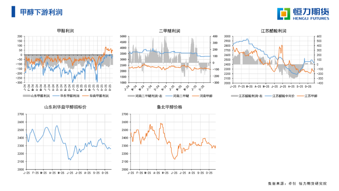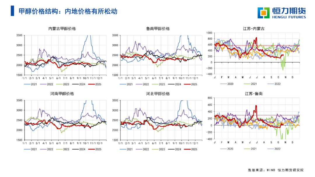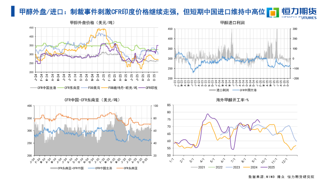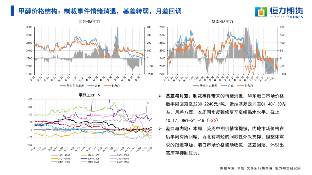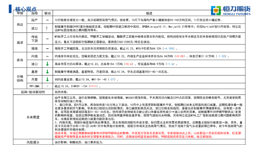 1、港口市场,自9月以来,库存始终在150万吨上下波动。10月中上旬虽受到制裁事件干扰,但短期已经未见明显的进口减量,近期抵港体量一般也更多是受到天气影响,华东港口陆续出现封航情况。港口偏宽松格局未改,港口价格走势趋弱,基差也在制裁事件情绪缓和后,没有进一步修复,反而在本周逐渐回落至01-40/-30左右。但市场仍会持续关注能让进口体量实质性减少→港口去库的因素,故制裁事件对伊朗甲醇供应/发货的影响待观望,包括近期伊朗装置动态。目前有两套伊朗装置停车,但限气规划尚未明确,另有特立尼达MTHL工厂受到当地港口费问题影响而停车,故确实有推动远期进口减量的新因素出现。
